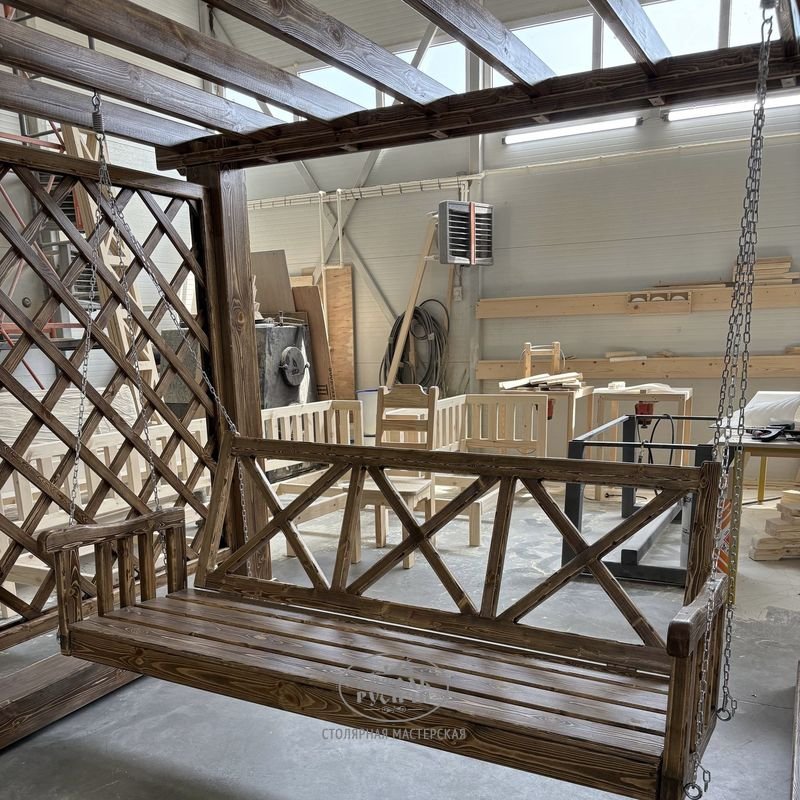 Садовые качели с перголой созданы мастерами дела столярного из массива сосны сибирской, да с заботой особой к деталям важным,