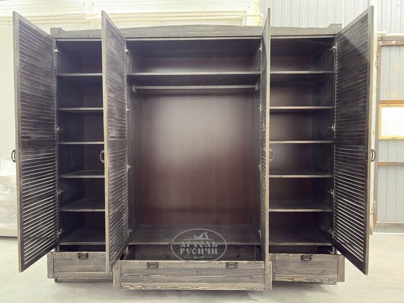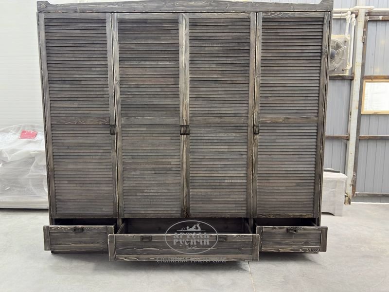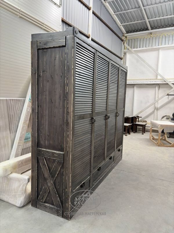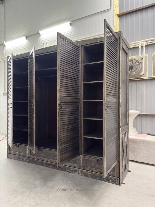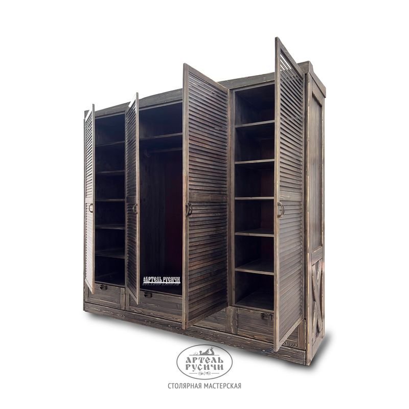 Вместительный четырёхстворчатый шкаф из коллекции «Loft» создан для ценителей натуральной мебели с характером. Это прочное и стильное изделие из цельного массива дерева станет надежным хранилищем для вашего гардероба и органично впишется в интерьер, оформленный в стиле лофт, кантри, ретро или классика. Особое внимание уделено бесшумной работе механизмов — высококачественная фурнитура обеспечивает плавное и тихое закрывание дверок и ящиков, которые не будут скрипеть даже после многих лет использования.