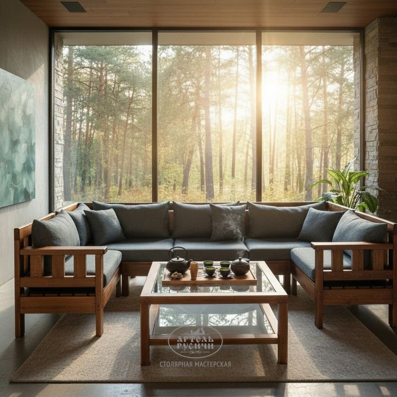 Комплект стильной мебели «Русский лофт» с мягкими сидушками и подушками состоит из дивана-скамьи под старину, кресел с подлокотником и журнального столика со стеклом. Эффектный комплект изготовлен из цельного массива натурального дерева (северной сосны) и представляет собой прочные, качественные и стильные предметы мебели, рассчитанные на десятки лет интенсивной эксплуатации.