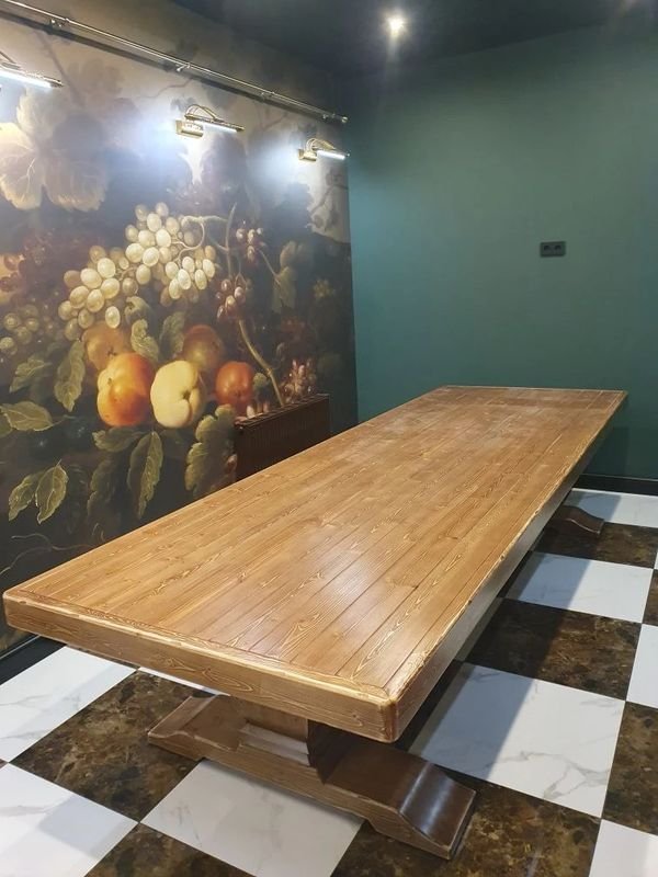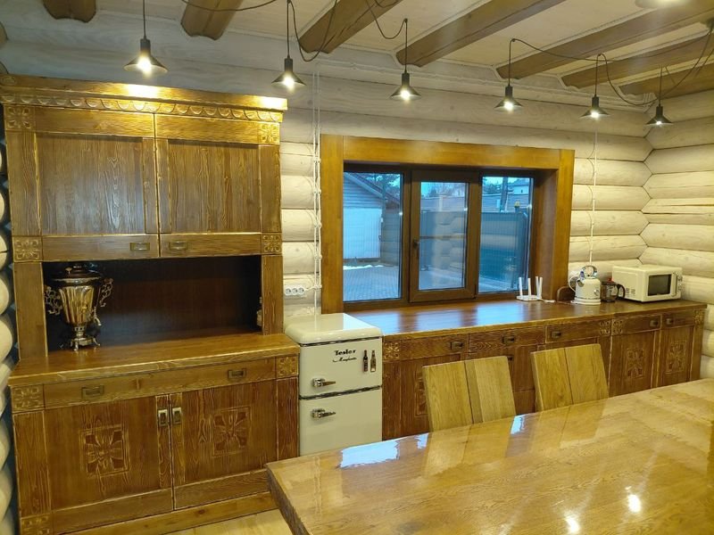 Мы работаем с массивом северной сосны, которую заказываем в Карелии. Северная сосна — более плотная, чем южная, она растет в суровых климатических условиях, и мебель из нее служит долго. А еще именно из этой древесины делали мебель во времена зарождения русского стиля. Мы обрабатываем сосну премиальными лакокрасочными материалами, подчеркиваем структуру дерева, создаем элементы старины — так и рождаются коллекции «Русичей».