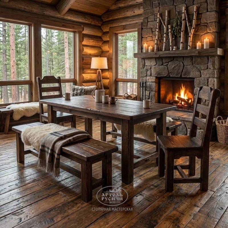 Состаренные стол, стулья и скамья выполнены в брутальном стиле, который отличают прямые линии, а нарочито грубые формы подчеркивают прочность и добротность конструкций — тот самый модный стиль лофт в древнерусской интерпретации.