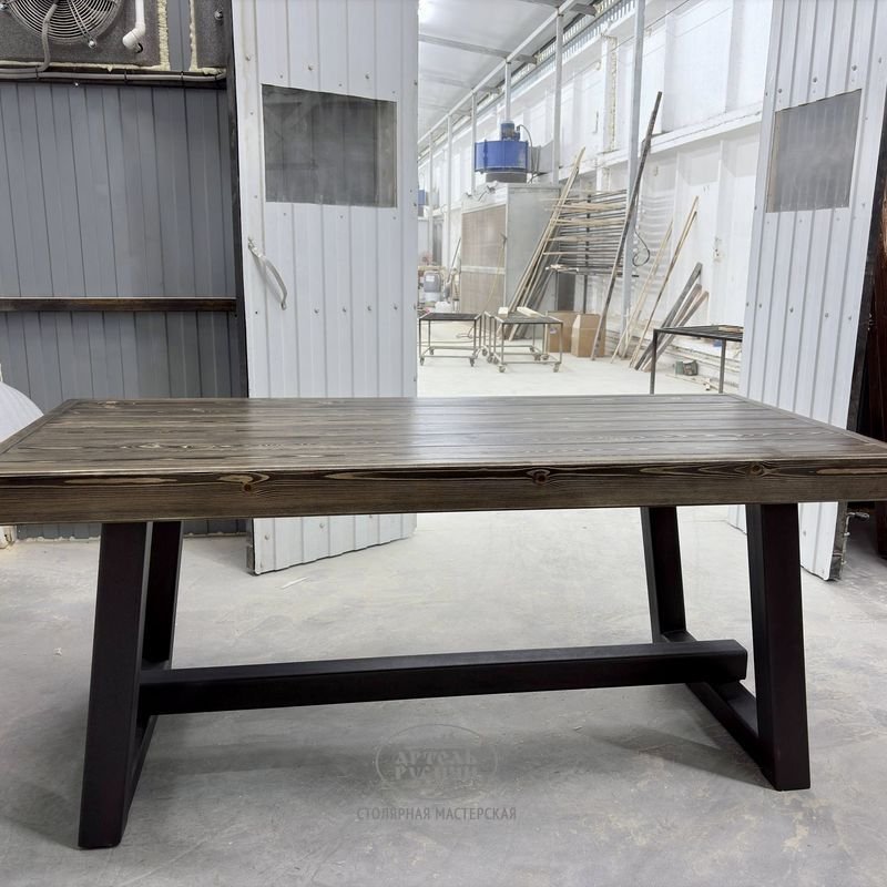 Обеденный стол ручной работы, созданный из цельного массива северной сосны с металлическим подстольем. Это прочная и надежная конструкция, рассчитанная на десятилетия активной эксплуатации.
