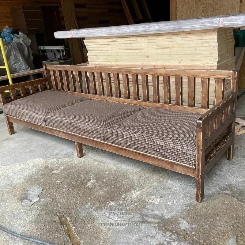 Садовый диван с подушками из коллекции «Русский лофт» сделан из цельного массива северной сосны и представляет собой долговечное, добротное и эстетически безупречное изделие, отвечающие самым строгим стандартам качества.