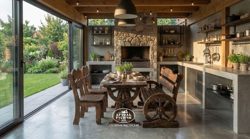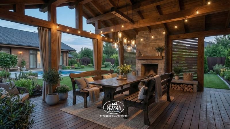 Обеденная группа из массива северной сосны в интерьере летней кухни. Коллекция "Ямщик"В зависимости от задачи мы используем два типа финишного лака.
