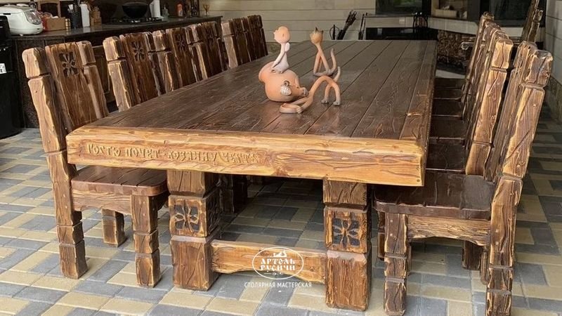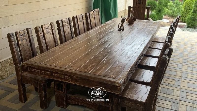 Суздальский деревянный стол, который простоял под навесом 9 летВ 2017 году мы сделали «Суздальский» стол для заказчика из Георгиевска — нашего родного города, где мы живём и где «Артель Русичи» уже много лет делает добротную деревянную мебель. Стол всё это время находился на улице под навесом. Причём не в глубине, а ближе к краю, где на него и на деревянные стулья из этого же комплекта регулярно попадали осадки: дождь и снег. Так он и стоял. Девять лет, между прочим, в условиях, которые сложно назвать щадящими.