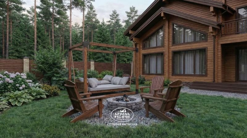 Кровать-качели и садовые кресла Адирондак на участке загородного домаДля мебели, которая круглый год находится под открытым небом — садовых кресел, качелей, диванных групп и уличных столов, — мы используем масло. Это принципиально иная философия защиты.