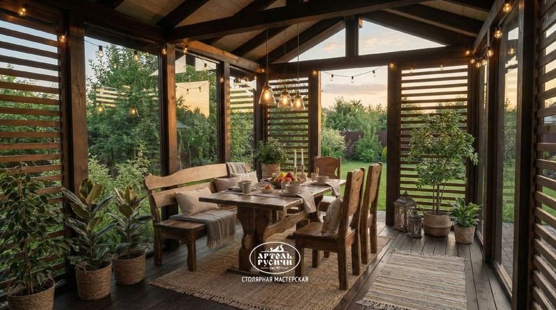 Комплект мебели из массива дерева в интерьере просторной беседки. Коллекция "Псковская"Лакированная мебель идеально подходит для: