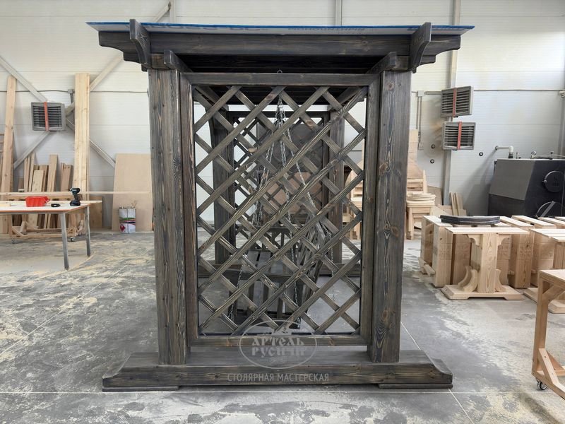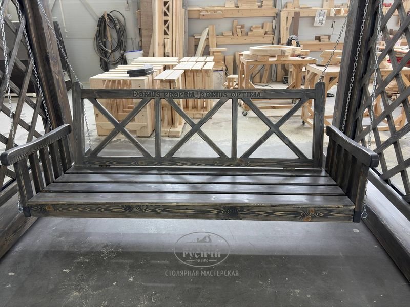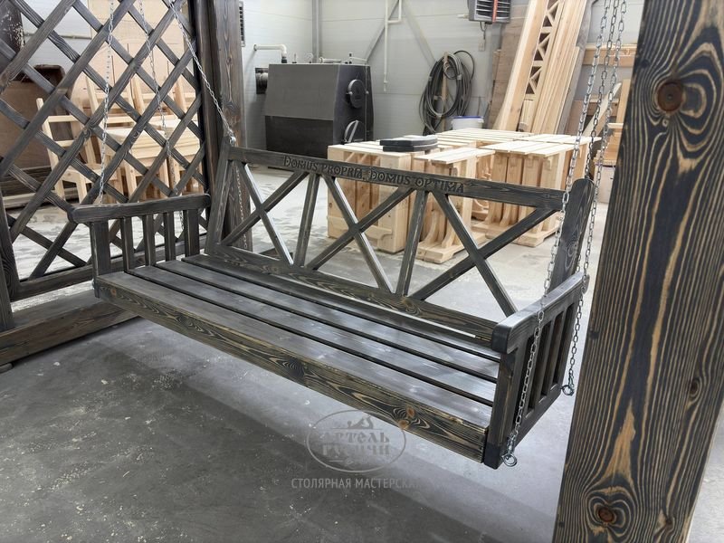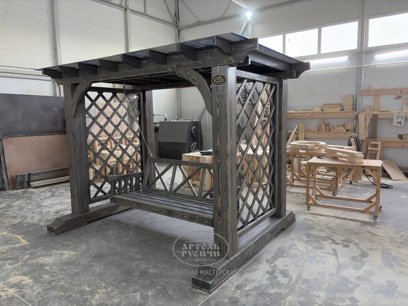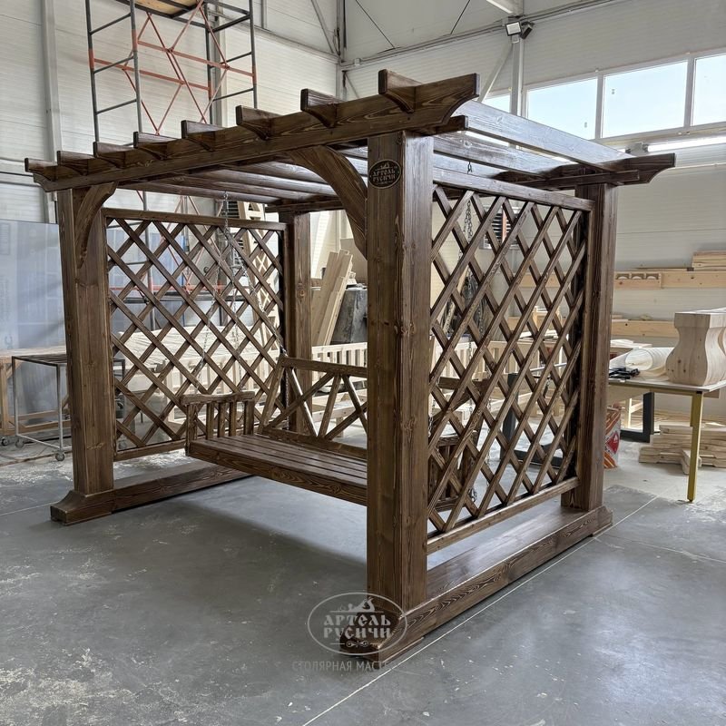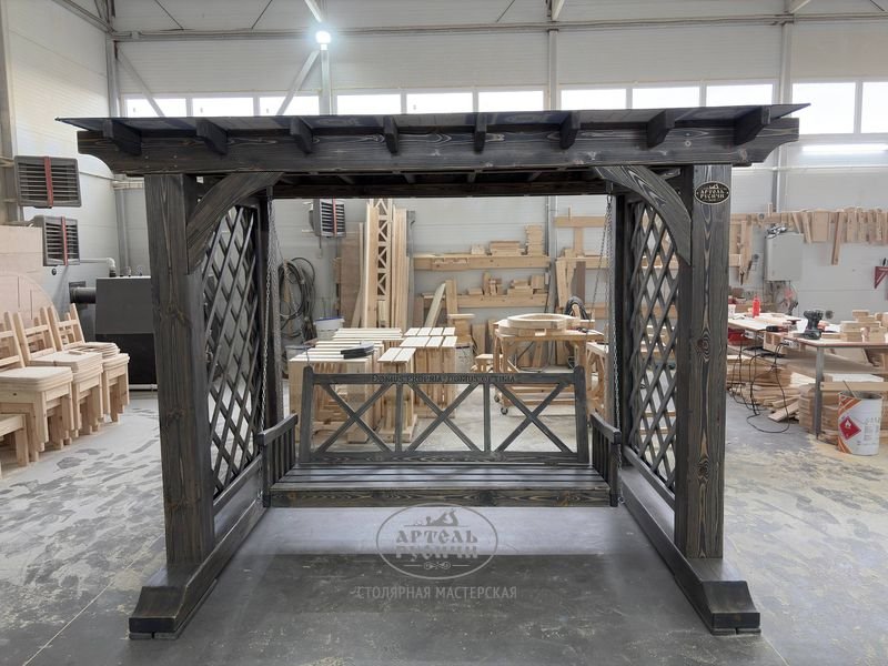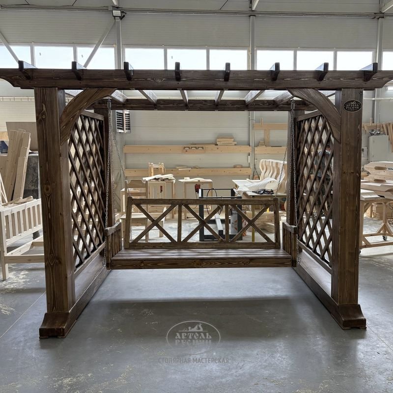 Садовые качели с перголой созданы мастерами дела столярного из массива сосны сибирской, да с заботой особой к деталям важным,