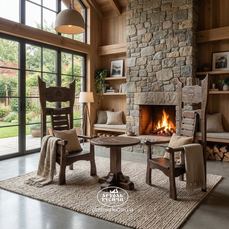 Комплект мебели «Викинг» с художественной резьбой состоит круглого стола и 2 атмосферных тронов под старину в оригинальном готическо-средневековом стиле. Материал изготовления - натуральная древесина (северная сосна). Дизайн этого комплекта уникален и неповторим. Изделия отличаются ярко выраженной харизмой, четкостью форм и определенной брутальностью.