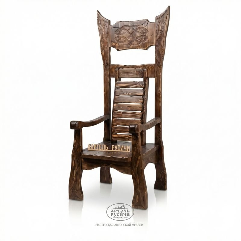 Стул «Викинг» в оригинальном готическо-средневековом дизайне изготовлен из цельного массива сосновой древесины и рассчитан на сотни лет безупречной службы. Конструкция деревянного трона такова, что даже самые интенсивные ежедневные нагрузки никак не отразятся на функциональности мебели и ее внешнем виде.