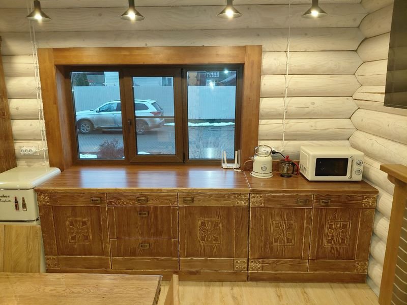 Для повышения срока службы изделия мастера «Артели «Русичи» применяют усиленный крепеж саморезами и профессиональные клеевые составы немецкого производства. При все этом металлические части (помимо ручек в винтажном стиле) искусно задекорированы деревянными деталями, так что никаких следов современности в этом «славянском» комплекте вы не найдете.