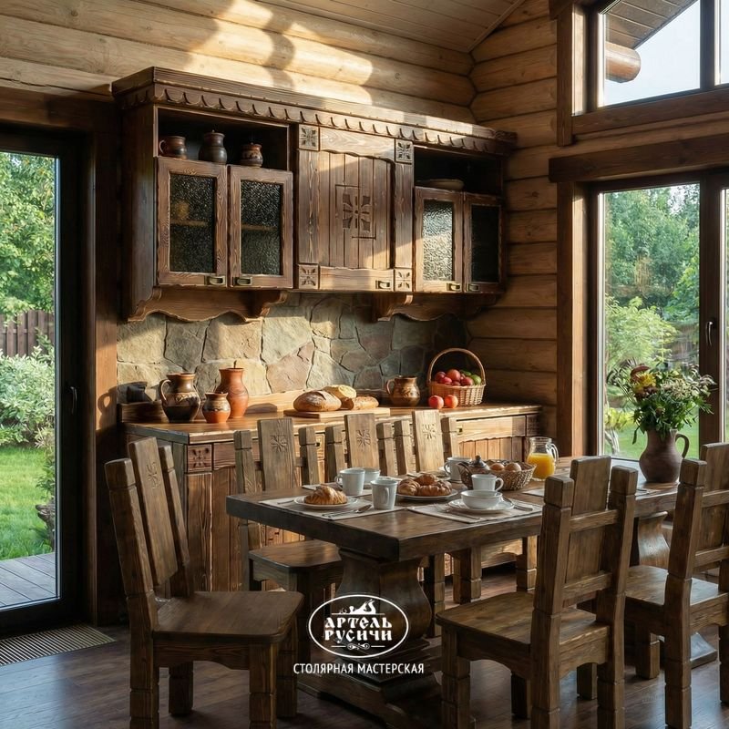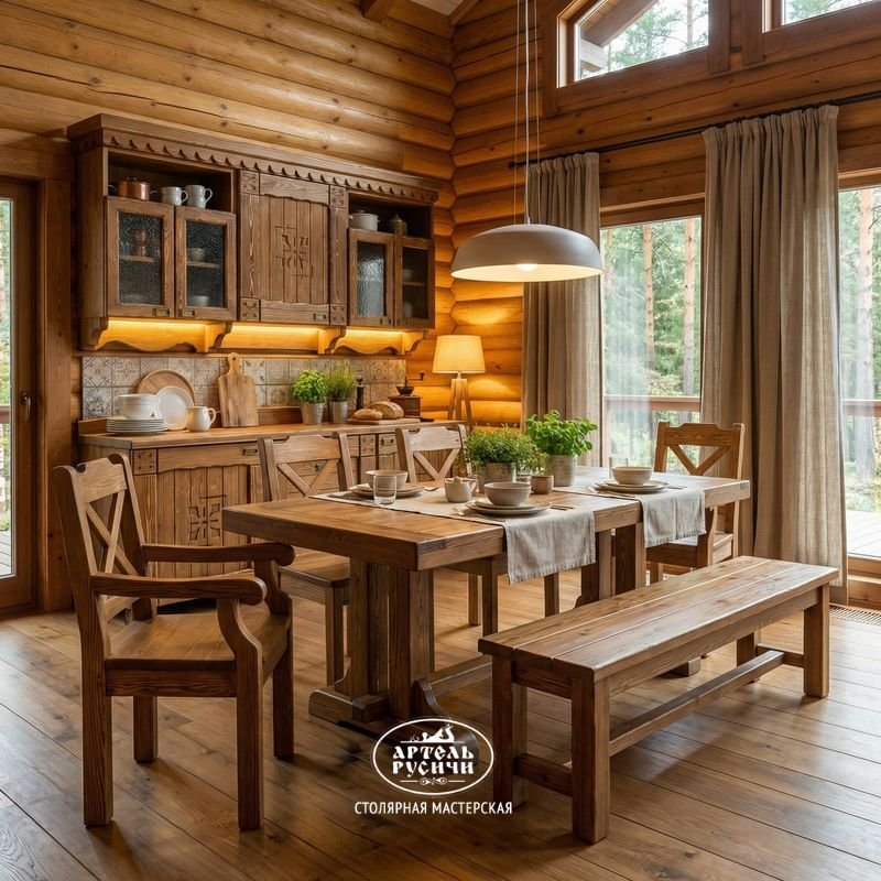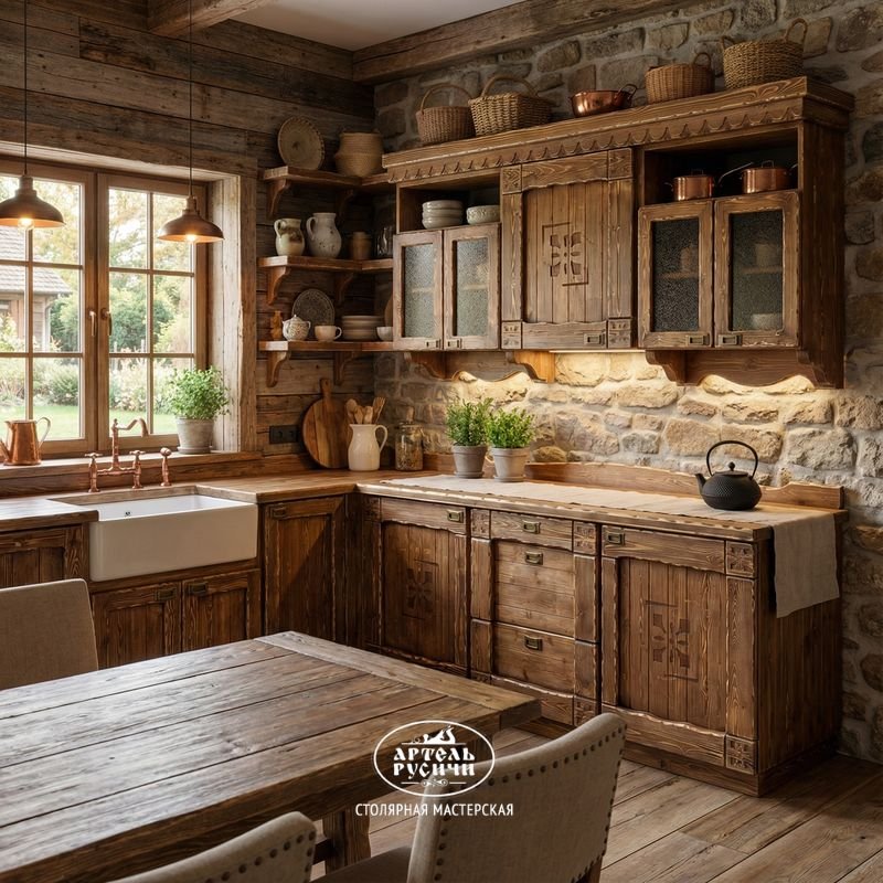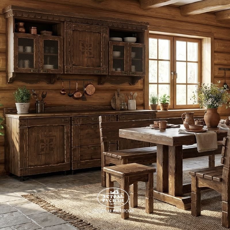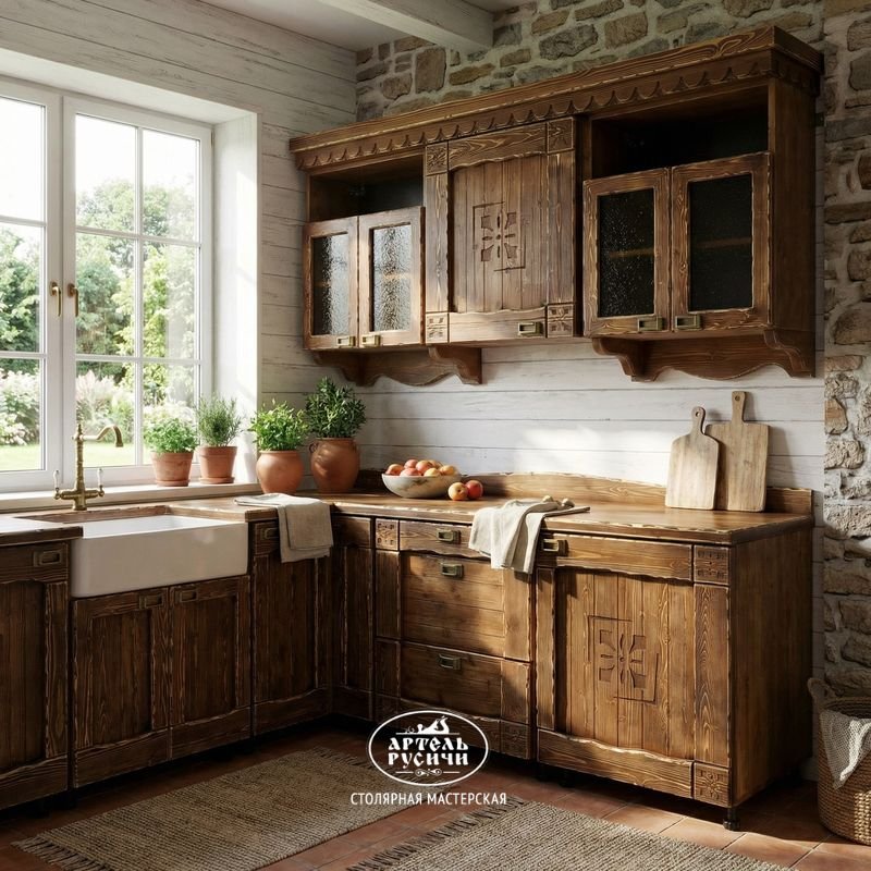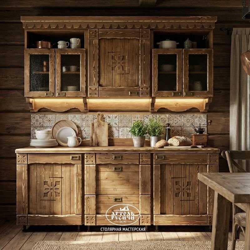 И хотя в своей работе мы пользуемся саморезами усиленной конструкции (для повышения прочности), все металлические элементы скрыты за декоративными деталями. Кухонный гарнитур из массива дерева «Суздальский» выглядит стильно и невероятно оригинально в интерьерах: лофт, шале, кантри, экостиль, прованс, рустик, этно.