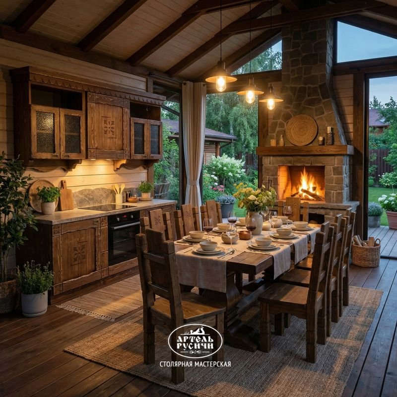 Деревянная кухонная мебель сделана нашими мастерами с любовью к своему делу. Опираясь на традиции русских зодчих, используя новейшие технологии и авторские секреты. Древесина прошедшая сушку по ГОСТу, обработанная исключительно натуральным составом добавляет к основному преимуществу мебели для кухни из дерева - экологичности и ряд других: