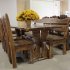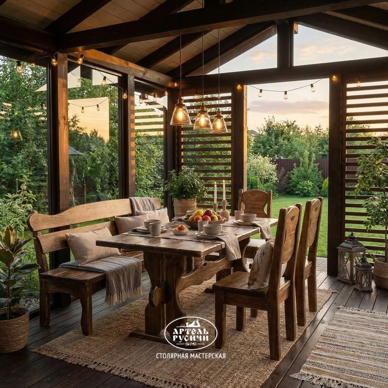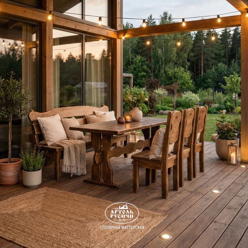 На таких деревянных стульях и скамье удобно сидеть, а за фактурным столом приятно вести задушевные беседы.