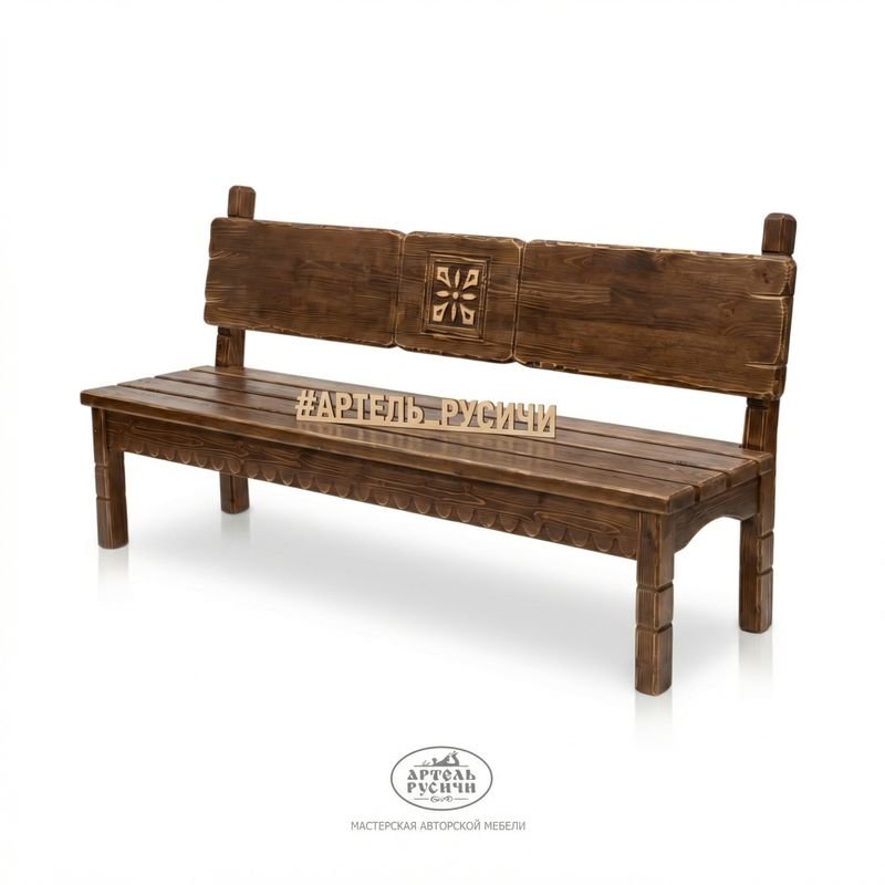 Массивные ножки стола сечением со всех сторон украшены резным состаренным орнаментом в традиционном стиле. Такие элементы напоминают о старорусских приемах мастеров деревянного зодчества. Этот же узор повторяется в резных элементах спинки скамьи и стульев с продуманной эргономикой — в них удобно сидеть долгое время. Лаконичные узоры выглядят стильно и подчеркивают национальный колорит всего комплекта.
