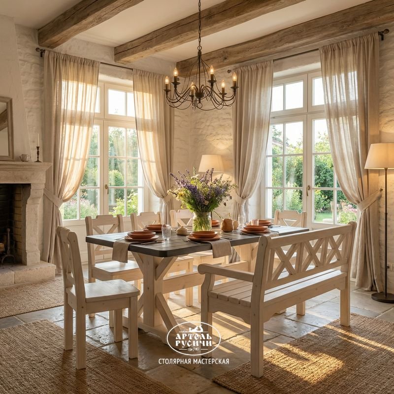 Создавая комплект мебели «Прованс», дизайнеры Артели «Русичи» вдохновлялись примерами декоративно-прикладного искусства в стиле французского кантри, применяя простые, но предельно надежные материалы и технологии. Комплект изготовлен из массива северной сосны полностью вручную и призван служить вам верой и правдой десятки лет.