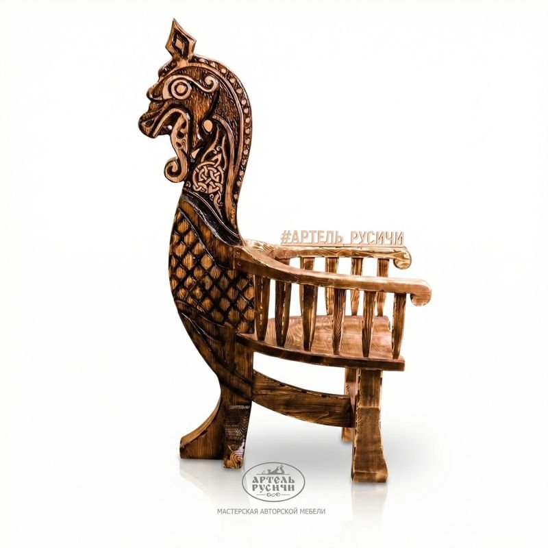 Два массивных кресла с резными узорами из состаренного дерева напоминающие носовую часть ладьи — драккара, украшенную головой мифического животного похожего одновременно и на боевого коня, и на дракона.
