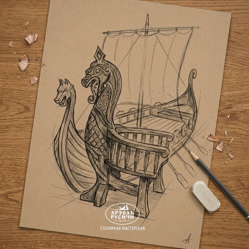 Эффектная, дизайнерская, антикварная мебель в виде старинного корабля — ладьи, драккара.