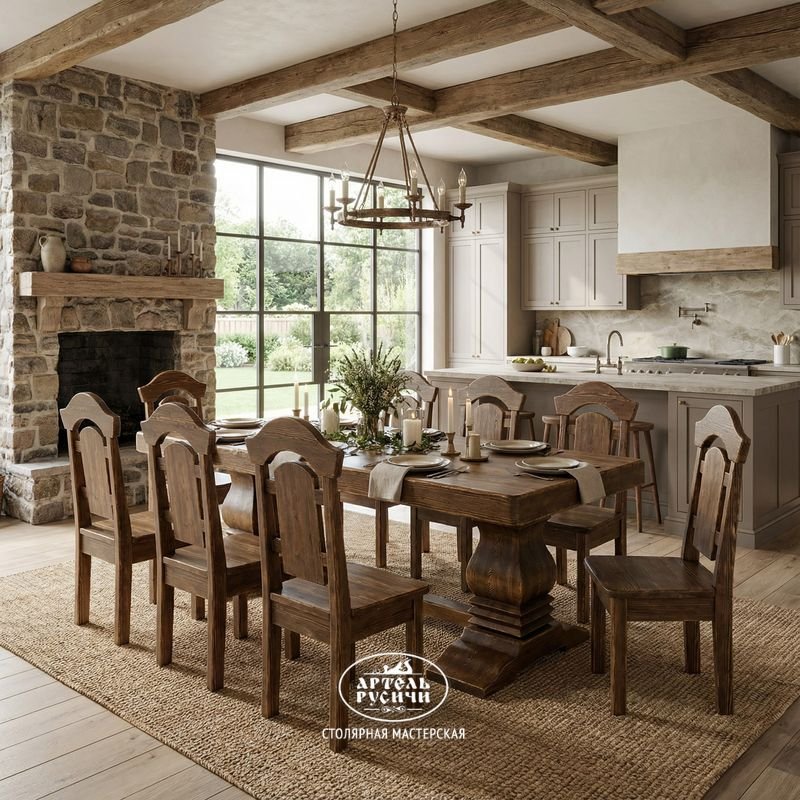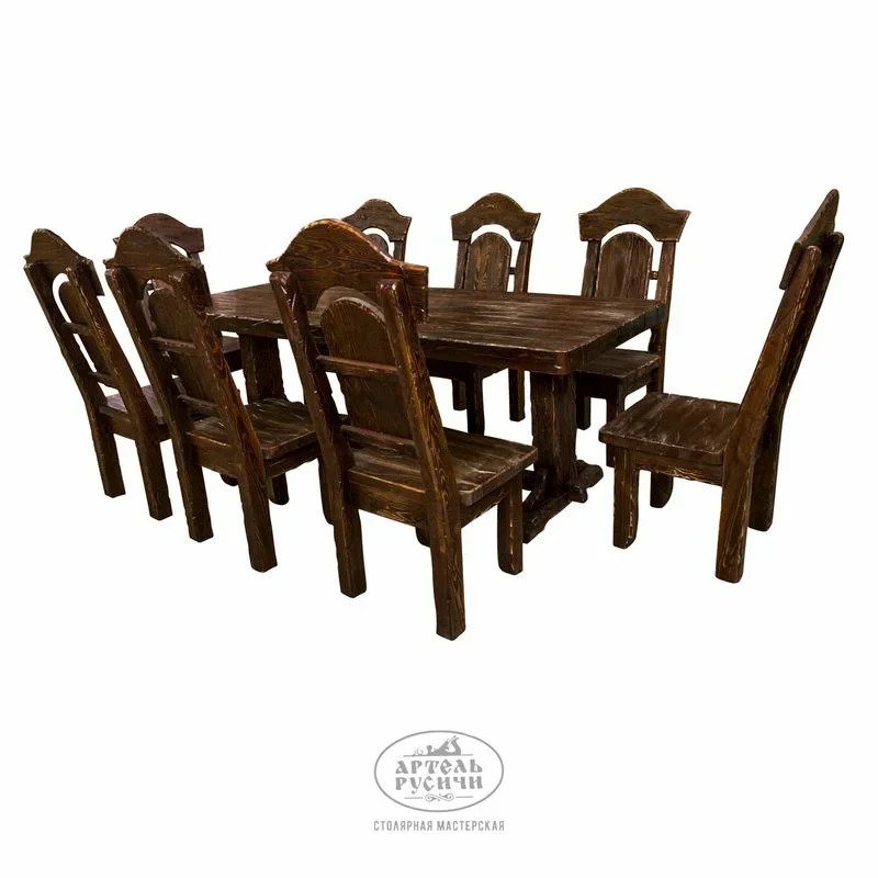 Комплект состаренной обеденной мебели «Белгородский» выполнен в брутальном средневековом стиле и призван стать главным акцентом интерьера.