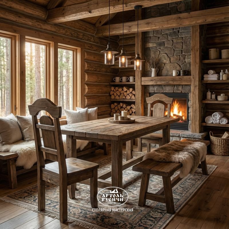 Добротную мебель под старину используют владельцы усадеб и загородных домов для оформление обеденной зоны в гостинной, в комнате отдыха в бане, на просторной террасе или в беседке на даче. Кроме того, брутальная мебель из массива сосны отлично смотрится в просторных залах ресторанов или кафе, оформленных в стилистике – кантри, шале, этно, рустика, лофт.