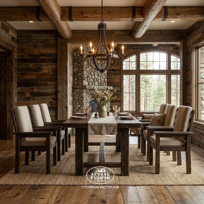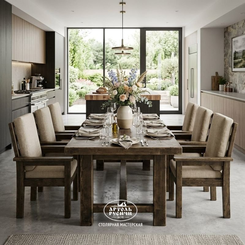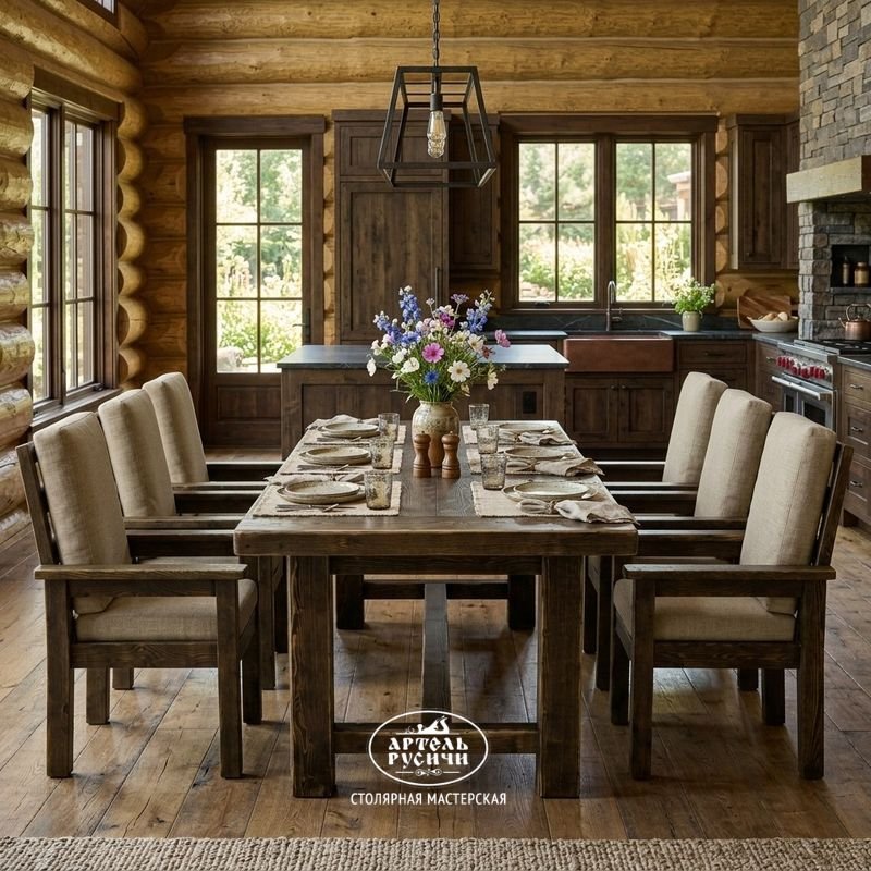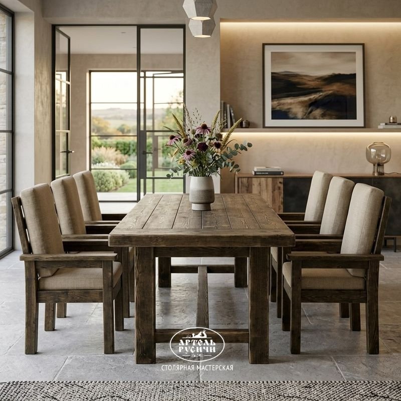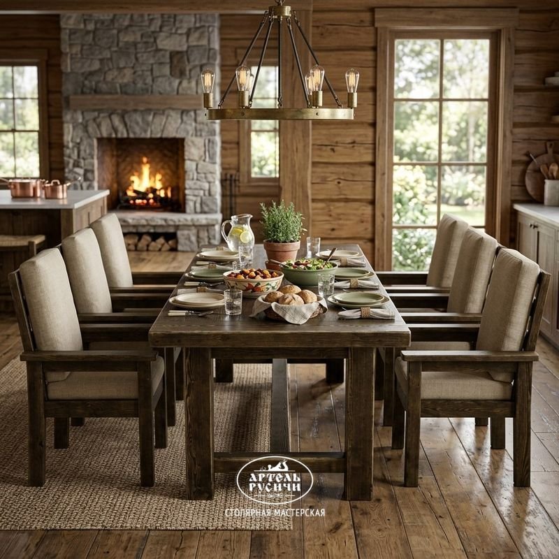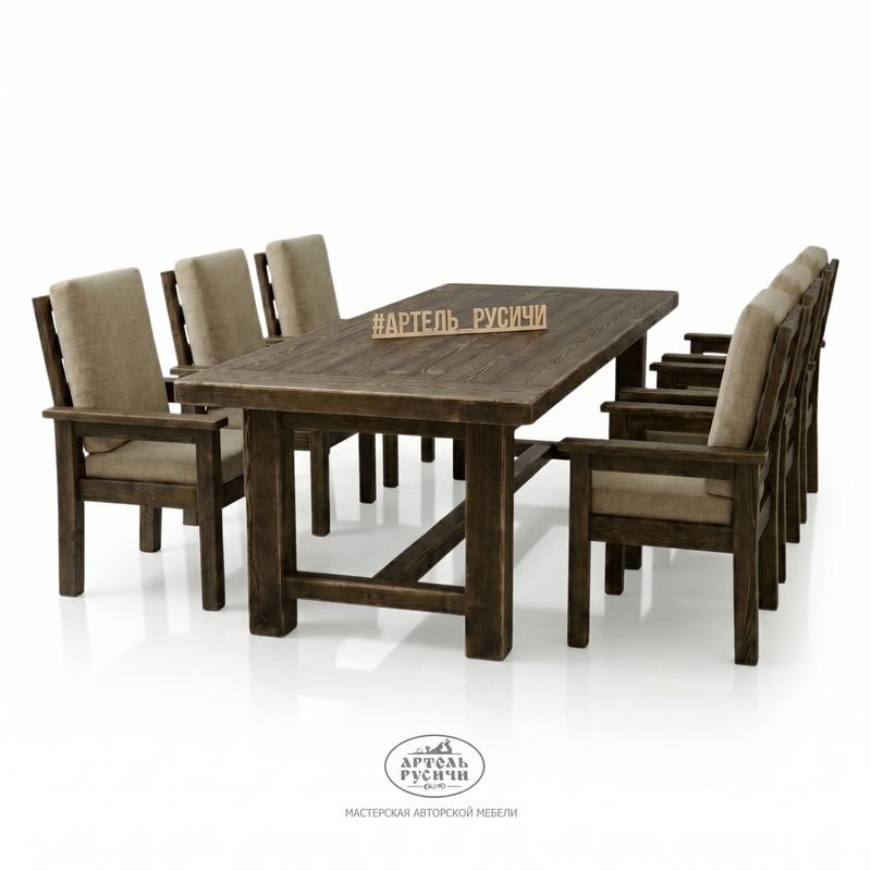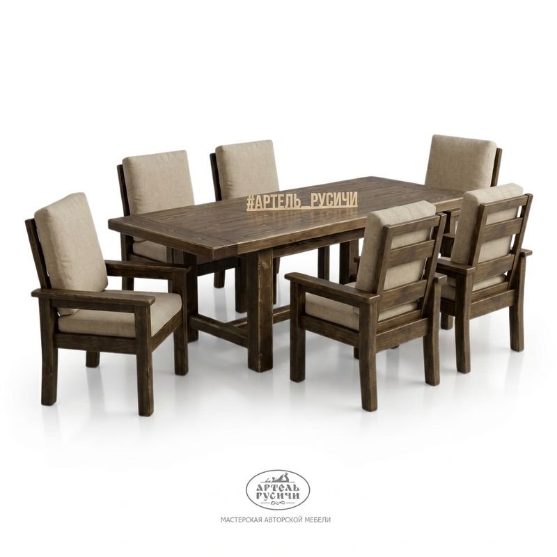 Представьте большой стол из тёплой северной сосны, за которым свободно размещается вся семья и гости. Рядом — шесть одинаковых стульев с мягкими подушками на сиденьях и спинках. Каждый стул имеет подлокотники, так что за столом будет комфортно и взрослым, и пожилым родственникам.