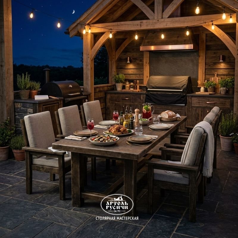 Стол и стулья выполнены из массива северной сосны — плотной, смолистой древесины, которая не боится влаги и перепадов температур. Дерево прошло камерную сушку, поэтому сохраняет свою форму долгие годы: не коробится, не трескается, не рассыхается. Натуральный рисунок и тёплый оттенок делают каждое изделие уникальным.