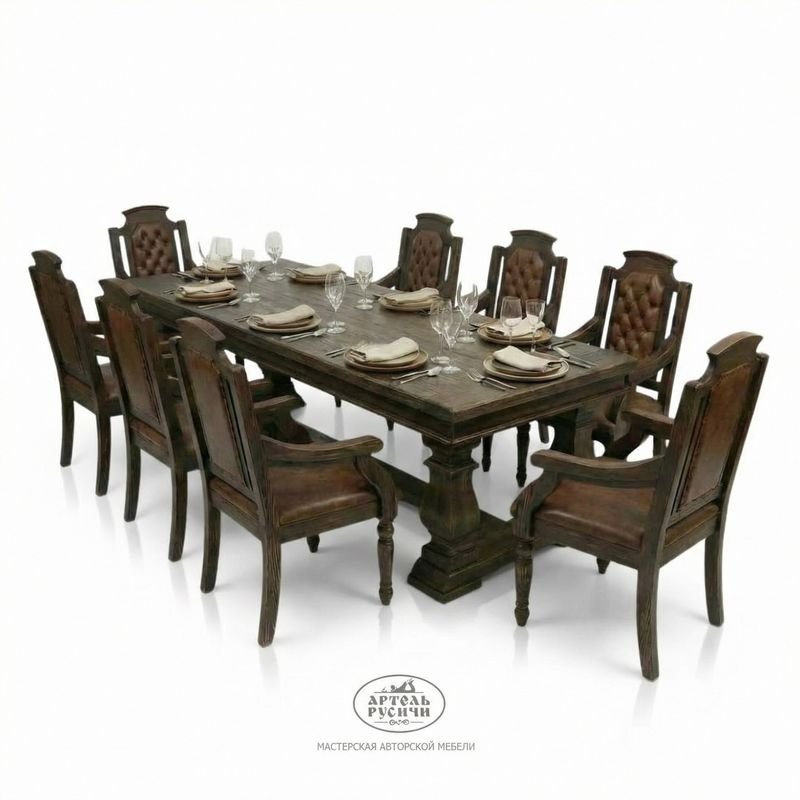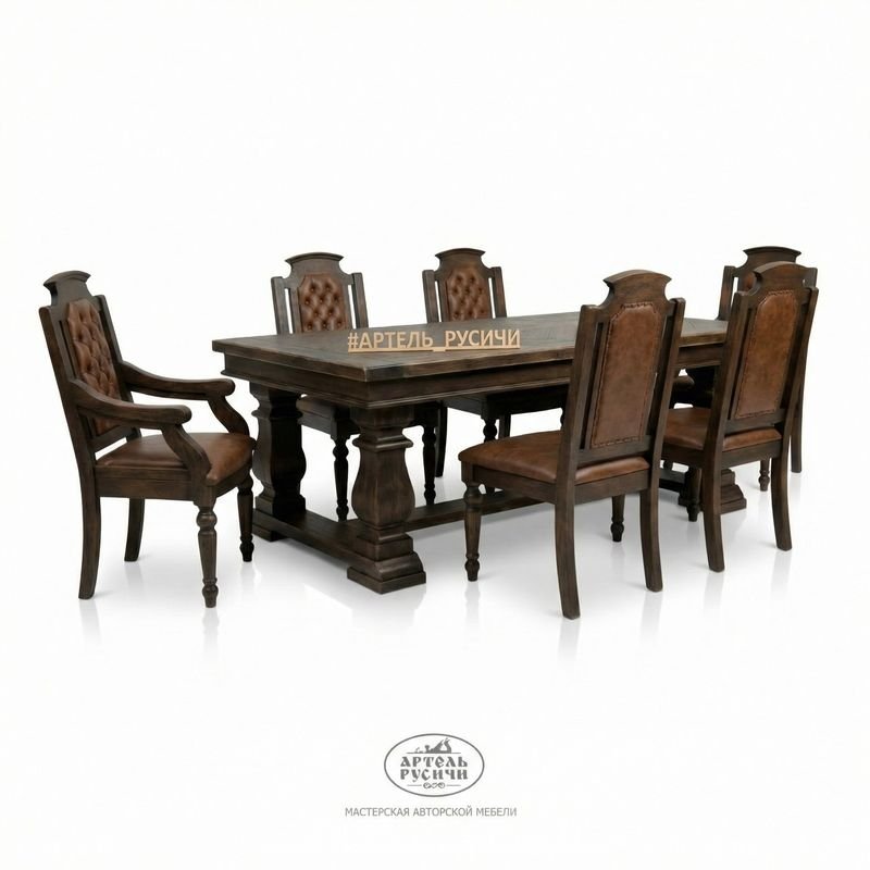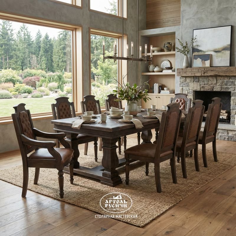 Обеденная группа демонстрирует безупречную гармонию. Стол и кресла выполнены в едином стилистическом ключе: массивные формы, благородная патина, тёплый оттенок дерева. Комплект не требует дополнительных поисков — вы получаете законченный ансамбль, идеально сочетающийся по цвету, фактуре и духу. Это инвестиция в уют, в статус и в будущее вашего дома на долгие десятилетия.