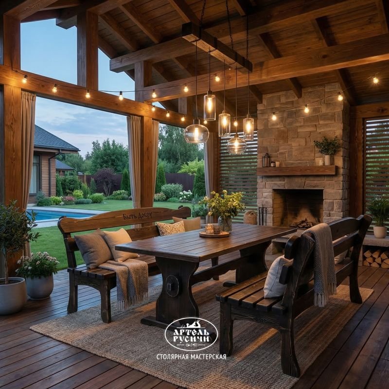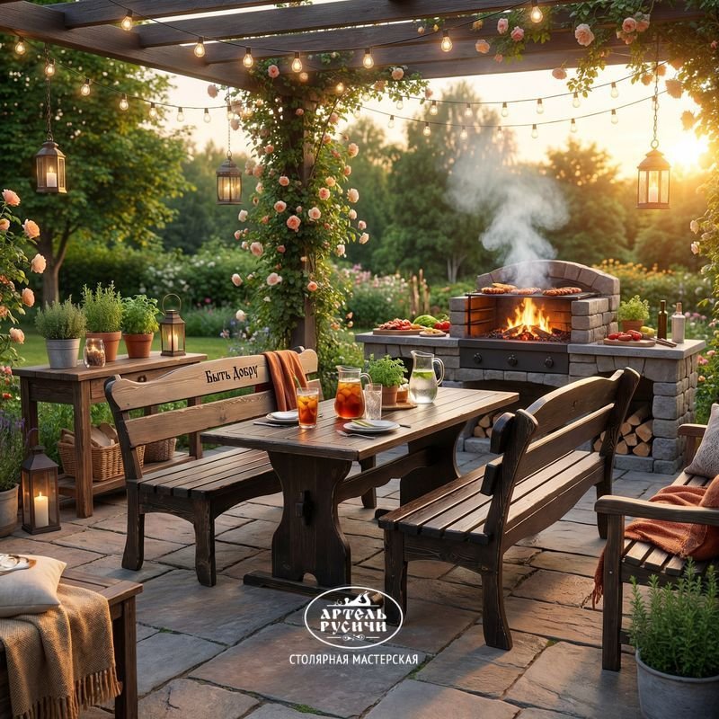 По вашему спецзаказу мы сделаем резную надпись на спинке скамьи или на торце стола, в которой отразим вашу индивидуальность. Например, мы можем написать: