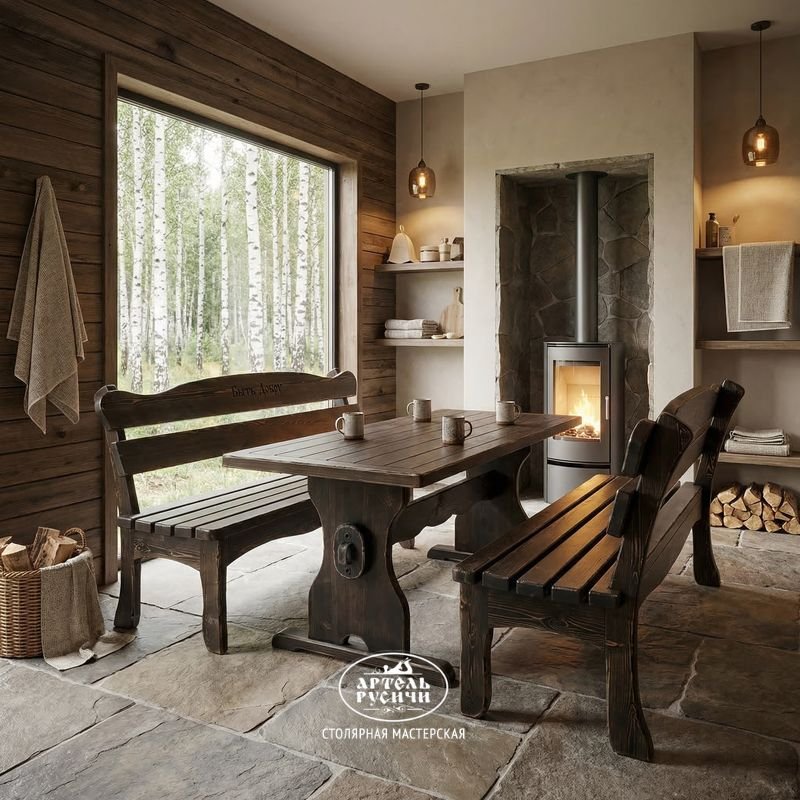 Комплект мебели «Псковский» на 6-8 персон состоит из 2-метрового стола и 2 скамеек. Материал изготовления - натуральная древесина (северная сосна).