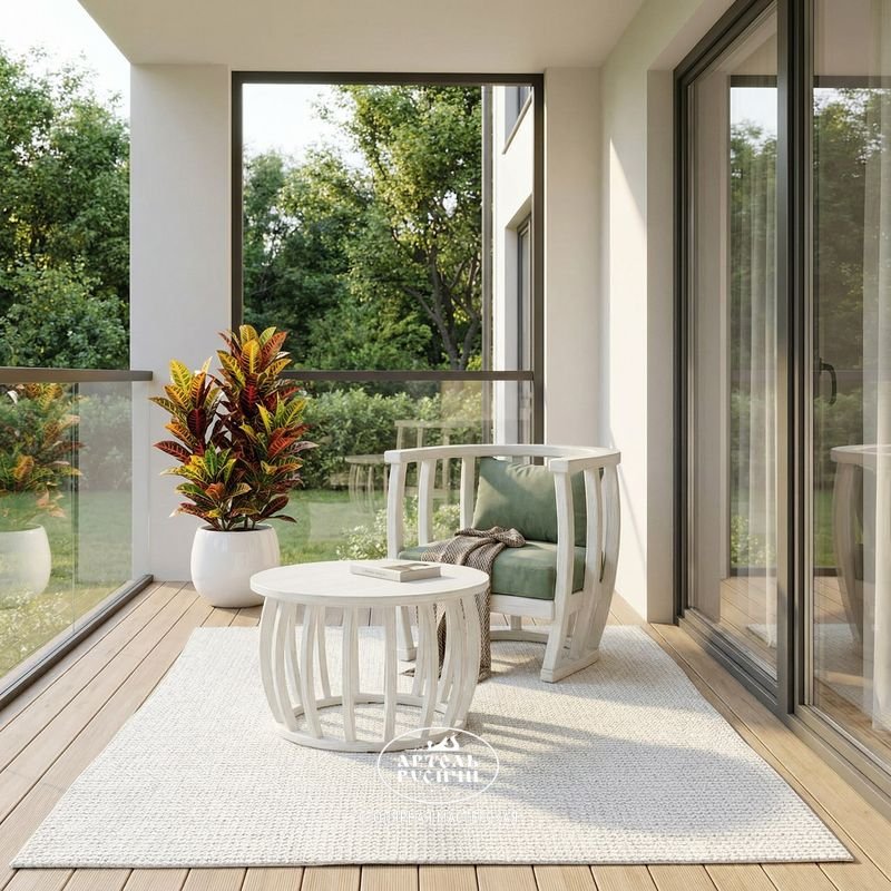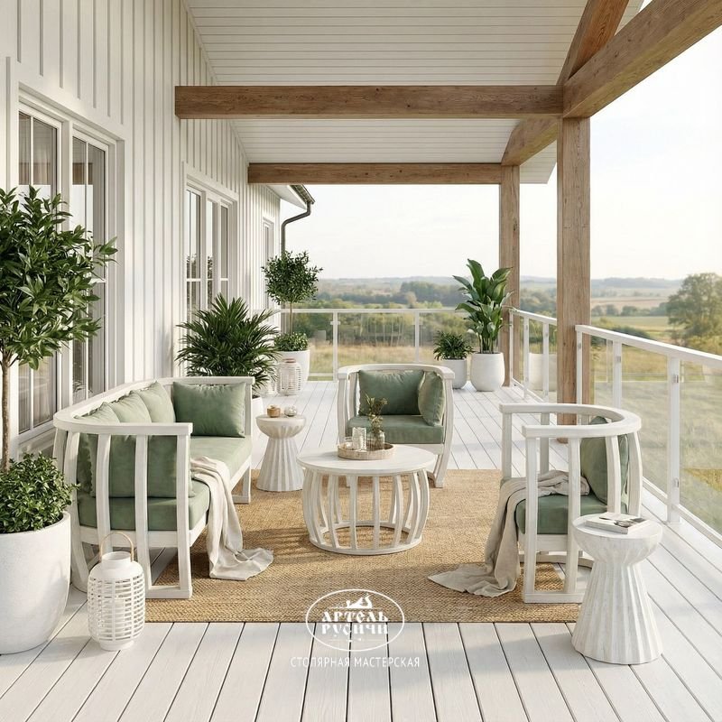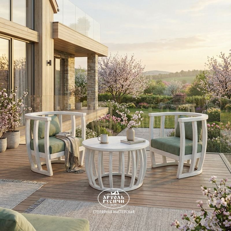 Для защиты в любых условиях каждый предмет обработан профессиональными маслами и лаками с усиленными УФ-фильтрами. Весь комплект создан, чтобы жить как в интерьере, так и на открытой террасе, оставаясь выразительным и надёжным акцентом круглый год.