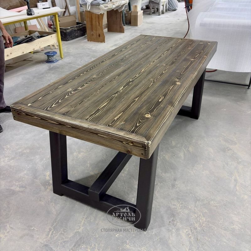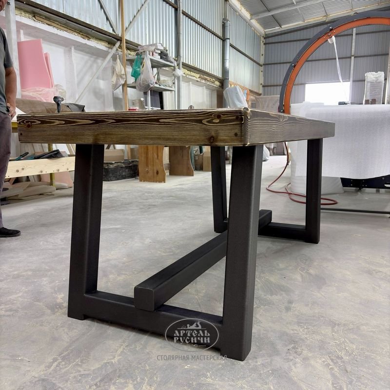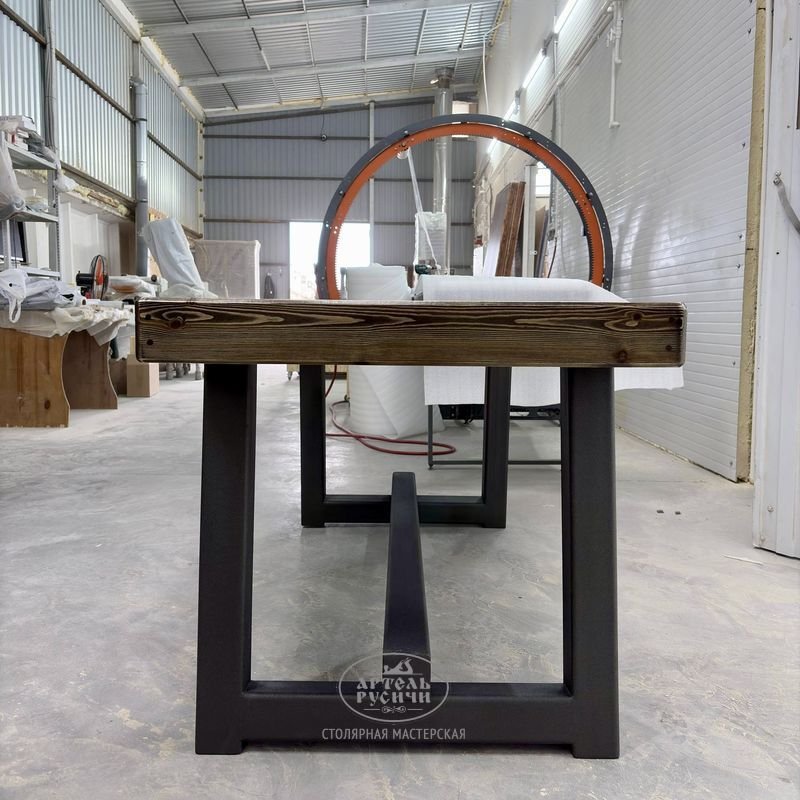 Сочетание металлического основания и массивной столешницы создает гармоничный дуэт индустриального стиля и традиционного мастерства, где каждая деталь хранит тепло человеческих рук и историю настоящей русской деревообработки.
