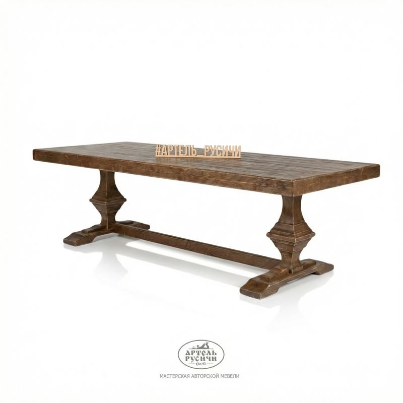 Особое внимание уделено эффекту искусственного состаривания – процедура выполнена по оригинальной авторской технологии, разработанной мастерами Артели «Русичи». Этот прием позволяет выделить уникальный природный узор древесины, подчеркнуть ее теплоту и текстуру, создать потертости на гранях мебели, искусно имитирующие длительное использование стола. Декоративный эффект старения при этом никак не отражается на функциональных качествах изделия.