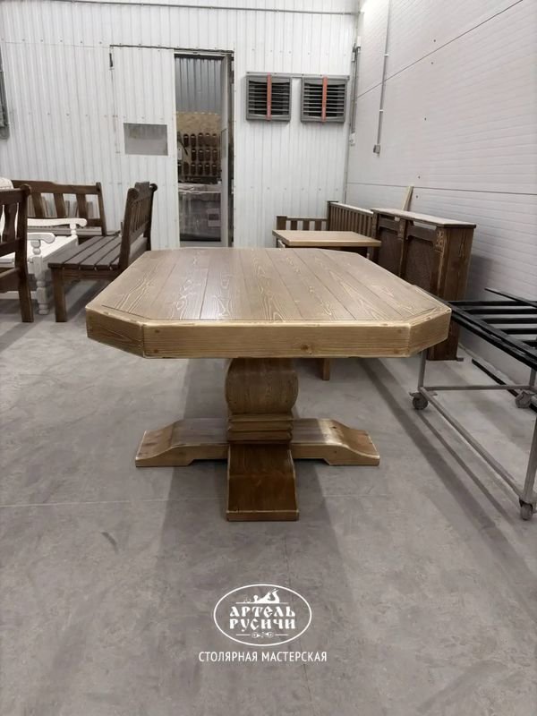 Массивный, но компактный стол «Георгиевский» на одной опоре отличается ярко выраженной харизмой, четкостью форм и определенной брутальностью. Основной материал изготовления – северная сосна, отличающаяся своей долговечностью и прочностью.