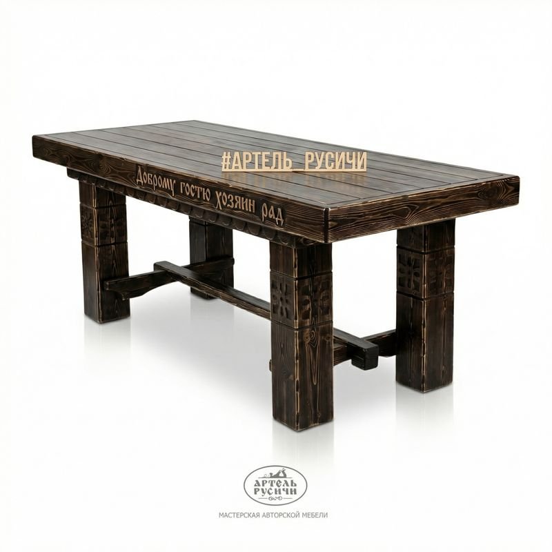 Эффект искусственного состаривания в сочетании c благородным матовым блеском создает достоверное ощущение старинной работы в исконно русском стиле. Нарочитая грубость стола усиливает впечатление старины и добротности изделия. Брутальный и при этом максимально лаконичный стиль по достоинству оценят ваши дети и внуки, ибо номинальный срок службы стола – 100 и более лет.