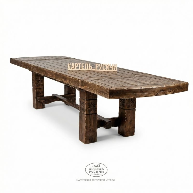 Эффект искусственного состаривания в сочетании благородным матовым блеском создает достоверное ощущение старинной работы в исконно русском стиле. Нарочитая грубость стола усиливает впечатление старины и добротности изделия. Брутальный и при этом максимально лаконичный стиль по достоинству оценят ваши дети и внуки, ибо номинальный срок службы стола – 100 и более лет.