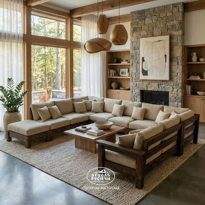 Мы создаём эту массивную композицию из северной сосны камерной сушки, рассчитанную на многолетнюю службу в условиях загородной жизни. Диван становится главным героем интерьера, его смысловым и эмоциональным центром. Вы можете выбрать стандартную конфигурацию или скорректировать длину каждой секции, чтобы мебель идеально повторила геометрию вашего помещения.