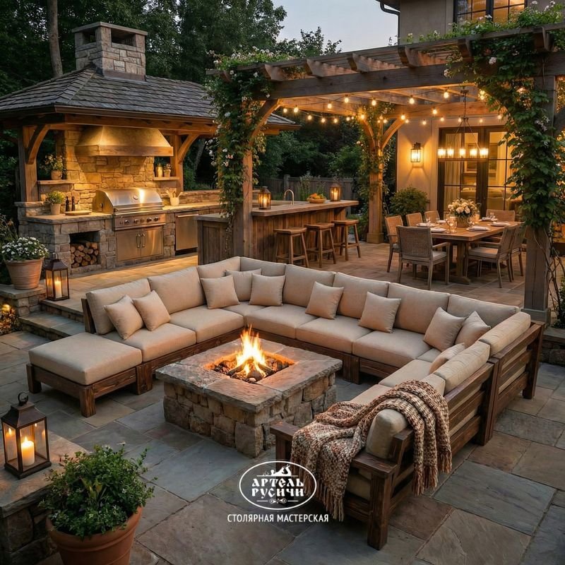 На большой террасе, под навесом у мангала или в комнате отдыха бани этот диван выполняет роль гостеприимного острова. Его конфигурация позволяет гостям общаться, не крича через стол, а сидя рядом. Он идеально подходит для летних вечеринок, семейных обедов на свежем воздухе и отдыха после парной.