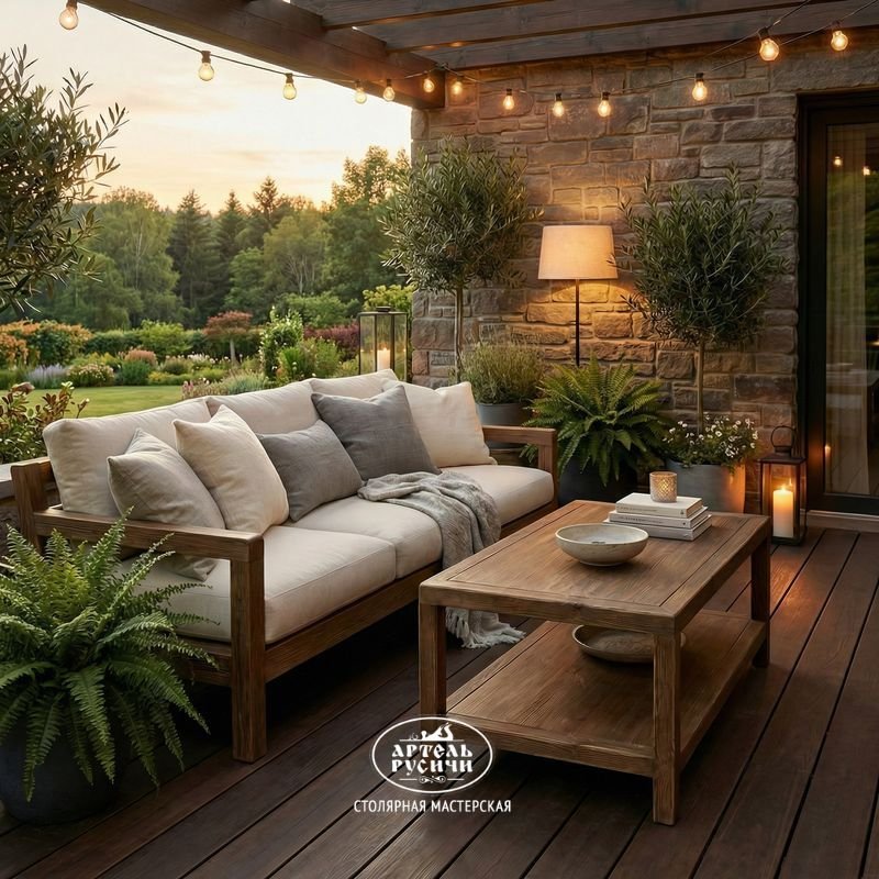 Он создан для этого. Камерная сушка и правильная защитная обработка делают массив сосны стабильным. Он не коробится от влаги и спокойно переносит условия террасы или комнаты отдыха. Для круглогодичного использования на открытом воздухе рекомендуем раз 2-3 года обновлять защитное масло.